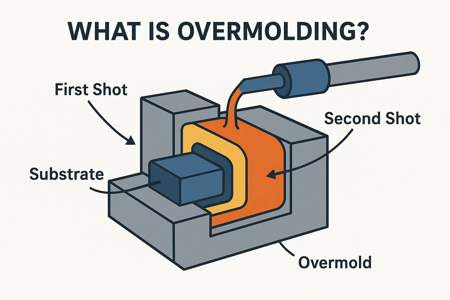 Overmolding เป็นกระบวนการสองขั้นตอนต่อเนื่องที่วัสดุที่สองถูกหล่อหลอมเหนือส่วนที่เป็นของแข็งและมีอยู่ก่อน เหมาะอย่างยิ่งสำหรับการเพิ่มเลเยอร์อ่อนลงในฐานที่เข้มงวด