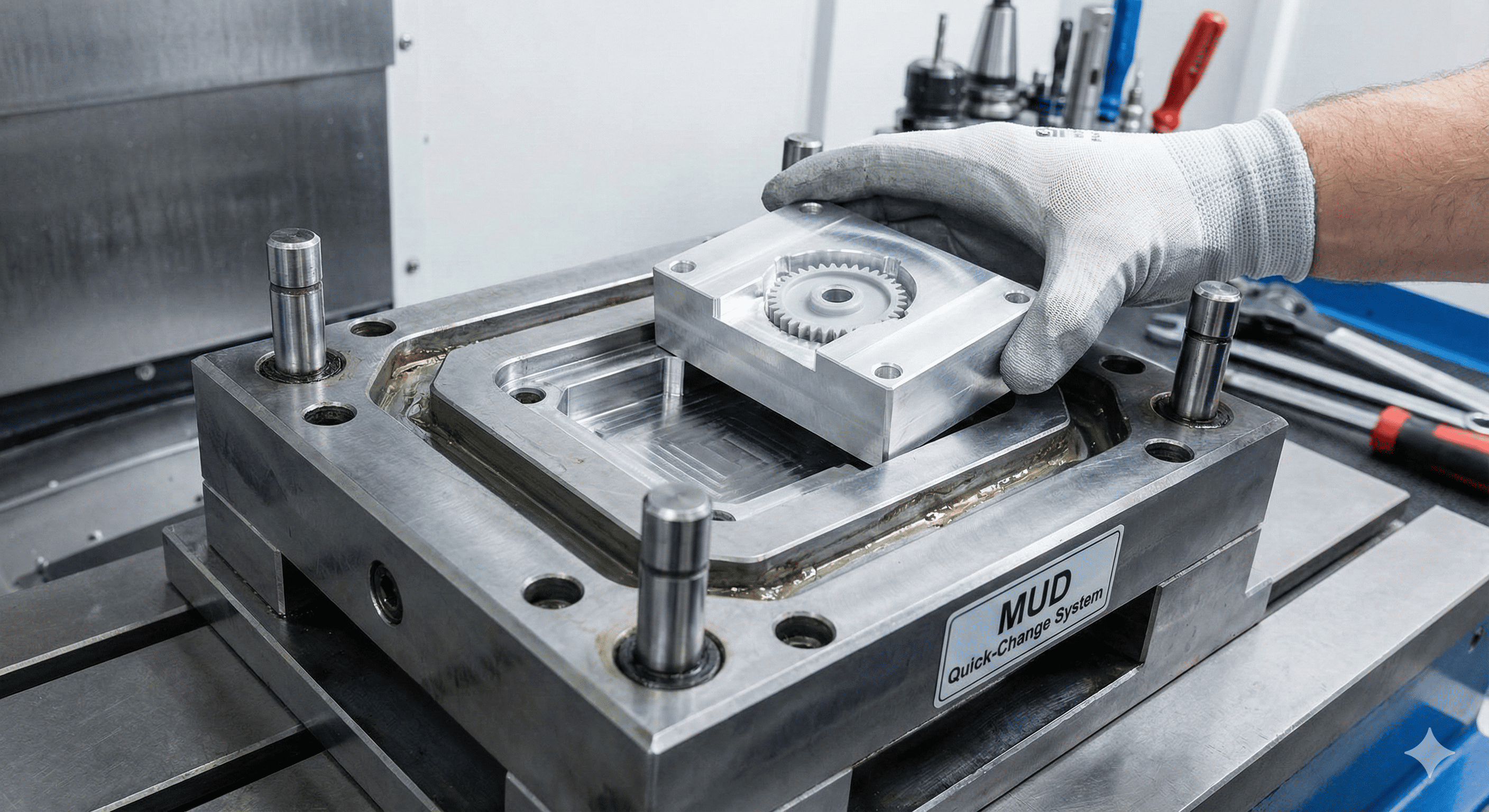 การยกของหนักเกิดขึ้นในระหว่าง การออกแบบแม่พิมพ์ - ในการผลิตที่มีปริมาณมาก คุณกังวลเกี่ยวกับเวลาทุกๆ ไมโครวินาทีของรอบเวลา ดังนั้นคุณจึงสร้าง "แจ็คเก็ตน้ำ" ที่ซับซ้อนเพื่อระบายความร้อน ในการขึ้นรูปแบบปริมาณน้อย เราจะทำให้ง่ายขึ้น เราใช้ มาสเตอร์ยูนิตดาย (โคลน) ฐาน—เฟรมมาตรฐานที่รองรับส่วนแทรกแบบกำหนดเอง ซึ่งหมายความว่าเราต้องตัด "โพรง" (รูปร่างของชิ้นส่วน) เท่านั้น ไม่ใช่ตัดบล็อกโลหะขนาดใหญ่ทั้งหมด