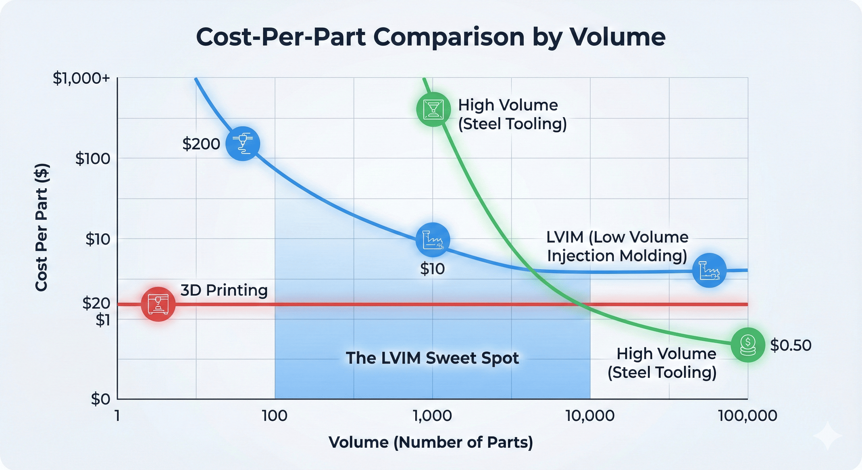 บางครั้ง "เสียงต่ำ" จริงๆ แล้วคือ "เสียงเต็ม" ของคุณ หากคุณกำลังสร้างอุปกรณ์ทางการแพทย์ ชุดแผงหน้าปัดรถยนต์ระดับไฮเอนด์ หรือส่วนประกอบโดรนเฉพาะทาง คุณอาจต้องการเพียง 2,000 ชิ้นต่อปีเท่านั้น ในกรณีเหล่านี้ การใช้จ่าย 80,000 ดอลลาร์ไปกับเครื่องมือแบบหลายช่องถือเป็นธุรกิจที่ไม่ดี LVIM กลายเป็นโซลูชันการผลิตแบบถาวรของคุณ โดยรักษาค่าใช้จ่ายให้ต่ำและรักษาอัตรากำไรให้อยู่ในเกณฑ์ดี