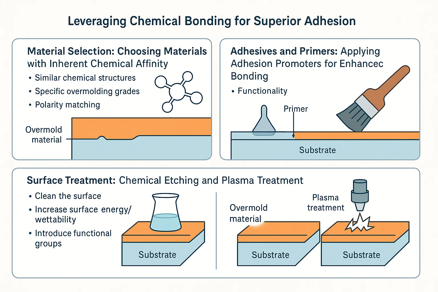 ในขณะที่กลไกเชิงกลให้สมอที่แข็งแกร่ง พันธะเคมี เสนอระดับสูงสุดของการยึดเกาะการสร้างอินเตอร์เฟสที่แยกกันไม่ออกอย่างแท้จริงระหว่างสารตั้งต้นและวัสดุ overmold วิธีนี้ขึ้นอยู่กับการมีปฏิสัมพันธ์ของโมเลกุลที่แท้จริงระหว่างโพลีเมอร์ทั้งสองซึ่งนำไปสู่พันธะที่มักจะแข็งแกร่งกว่าความแข็งแรงที่เหนียวแน่นของวัสดุทั้งสอง