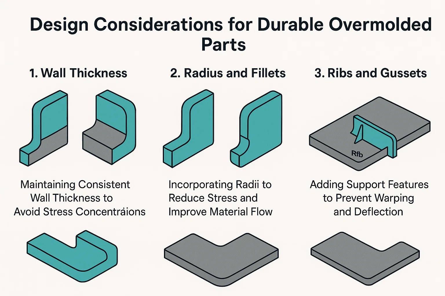 ความเข้มข้นของความเครียด: มุมที่คมชัดภายใน (ที่วัสดุ overmold ตรงกับพื้นผิว) สร้างจุดความเครียดที่มีการแปลทำให้พันธะเสี่ยงต่อการแตกหรือลอกภายใต้การเปลี่ยนแปลงของโหลดหรืออุณหภูมิ มุมที่คมชัดภายนอกอาจเป็นจุดอ่อน