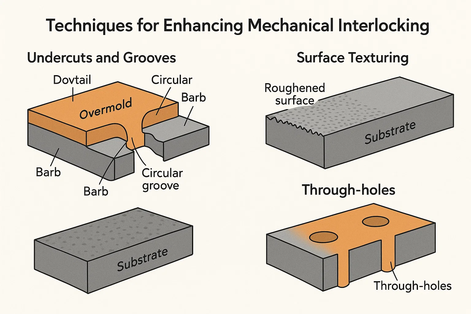 ในขณะที่ความเข้ากันได้ทางเคมีและการประมวลผลที่ดีที่สุดนั้นมีความสำคัญ กลไกเชิงกลประสาน ยืนเป็นวิธีที่แข็งแกร่งและมักจะขาดไม่ได้เพื่อให้แน่ใจว่ามีความผูกพันทางกายภาพที่แข็งแกร่งและมีอยู่มากเกินไป มันสร้าง "การยึดเกาะ" ที่แท้จริงระหว่างวัสดุทั้งสองป้องกันการแยกแม้ในขณะที่การยึดเกาะทางเคมีมี จำกัด นี่เป็นสิ่งสำคัญโดยเฉพาะอย่างยิ่งเมื่อวัสดุที่มีความสัมพันธ์ทางเคมีไม่ดีเช่นการยึดติดกับ TPE อ่อนกับพลาสติกพลังงานพื้นผิวต่ำเช่นโพลีโพรพีลีน (PP)