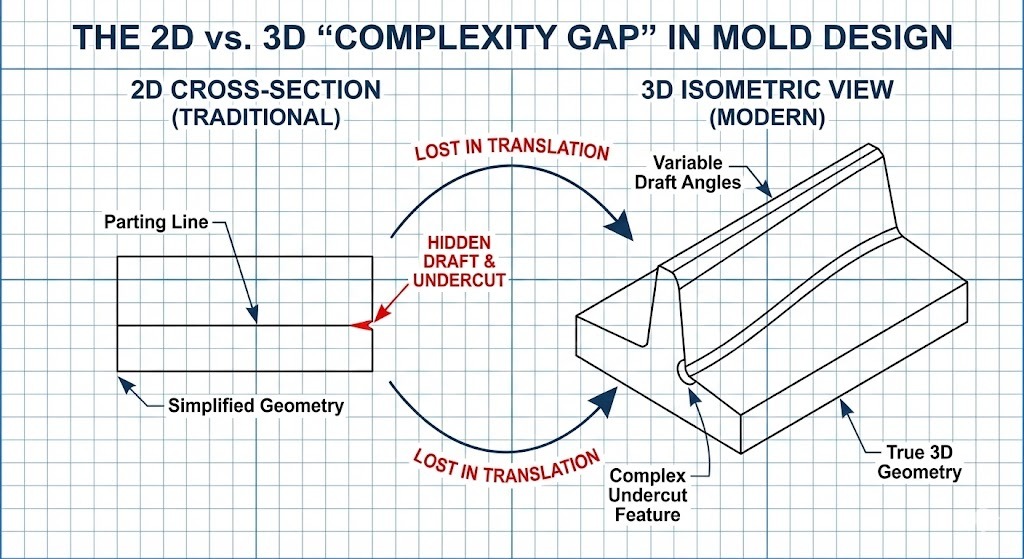 - ความไม่เข้ากันทางเรขาคณิต: การออกแบบ 2D มักจะขาดข้อมูลสำหรับมุมร่างที่แปรผัน ซึ่งจำเป็นสำหรับการดีดชิ้นส่วนพลาสติกที่ซับซ้อนออกอย่างหมดจด
