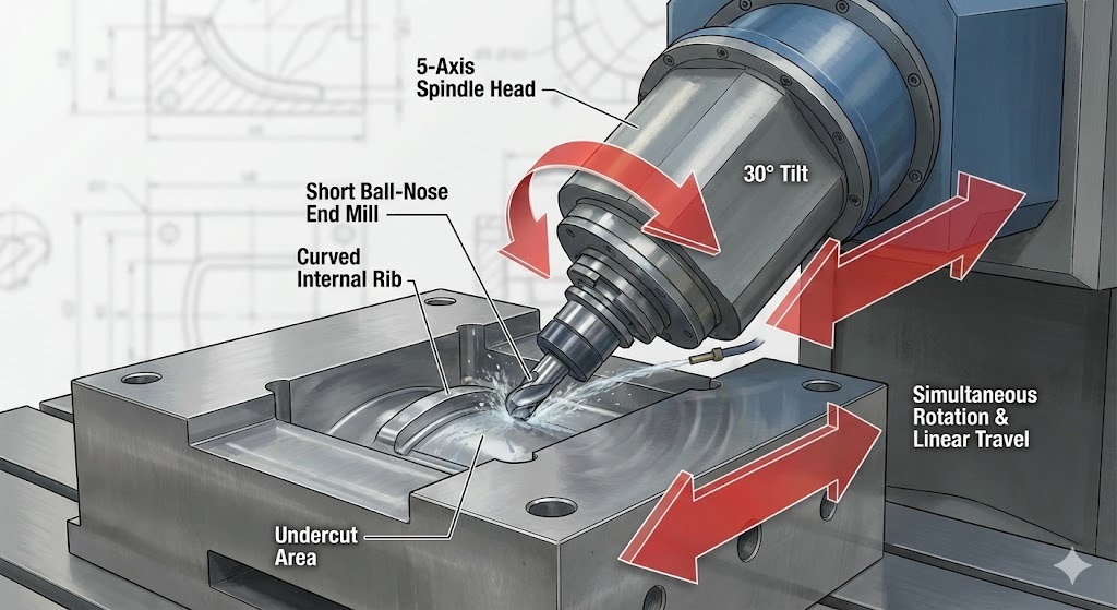 - ตัดราคา: พื้นที่แบบฝังของแม่พิมพ์ที่ "ซ่อน" จากเครื่องมือแนวตั้ง การเอียงแบบ 5 แกนช่วยให้เครื่องมือ "เข้าถึงใต้" ขอบเหล่านี้ได้