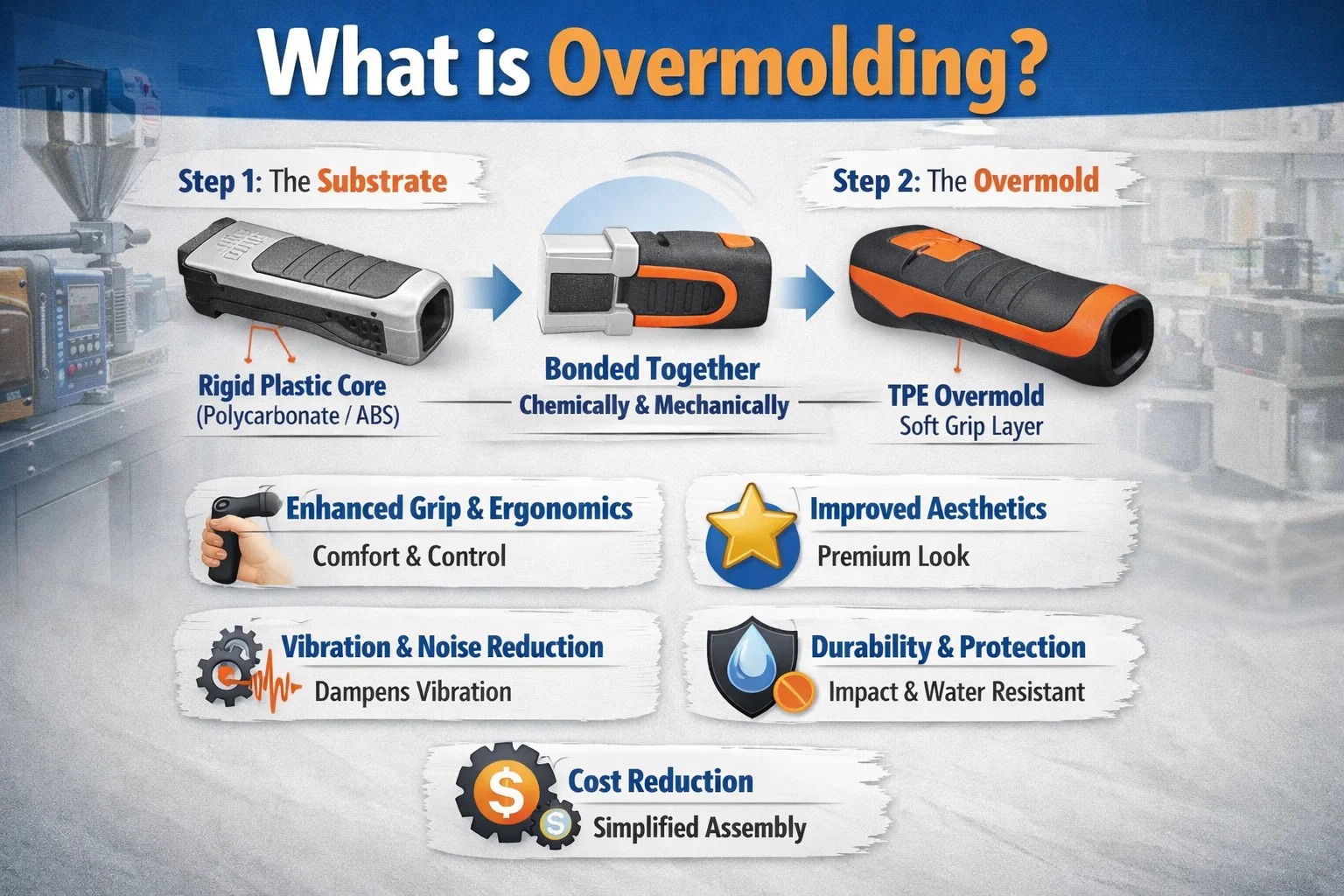 But overmolding isn’t just about making things feel nice. For engineers and B2B buyers, it represents a strategic manufacturing decision that can simplify assembly lines, seal out moisture, and absorb vibration—often while lowering total production costs.
