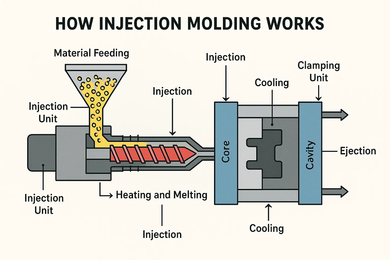 ลองนึกภาพกระบวนการที่มีการควบคุมและอัตโนมัติสูงซึ่งเปลี่ยนเม็ดพลาสติกดิบให้เป็นส่วนประกอบที่มีรูปร่างสมบูรณ์แบบในเวลาไม่กี่วินาที นั่นคือสิ่งที่เกิดขึ้นในระหว่างการฉีดขึ้นรูป กระบวนการสามารถแบ่งออกเป็นหลายขั้นตอนสำคัญ-