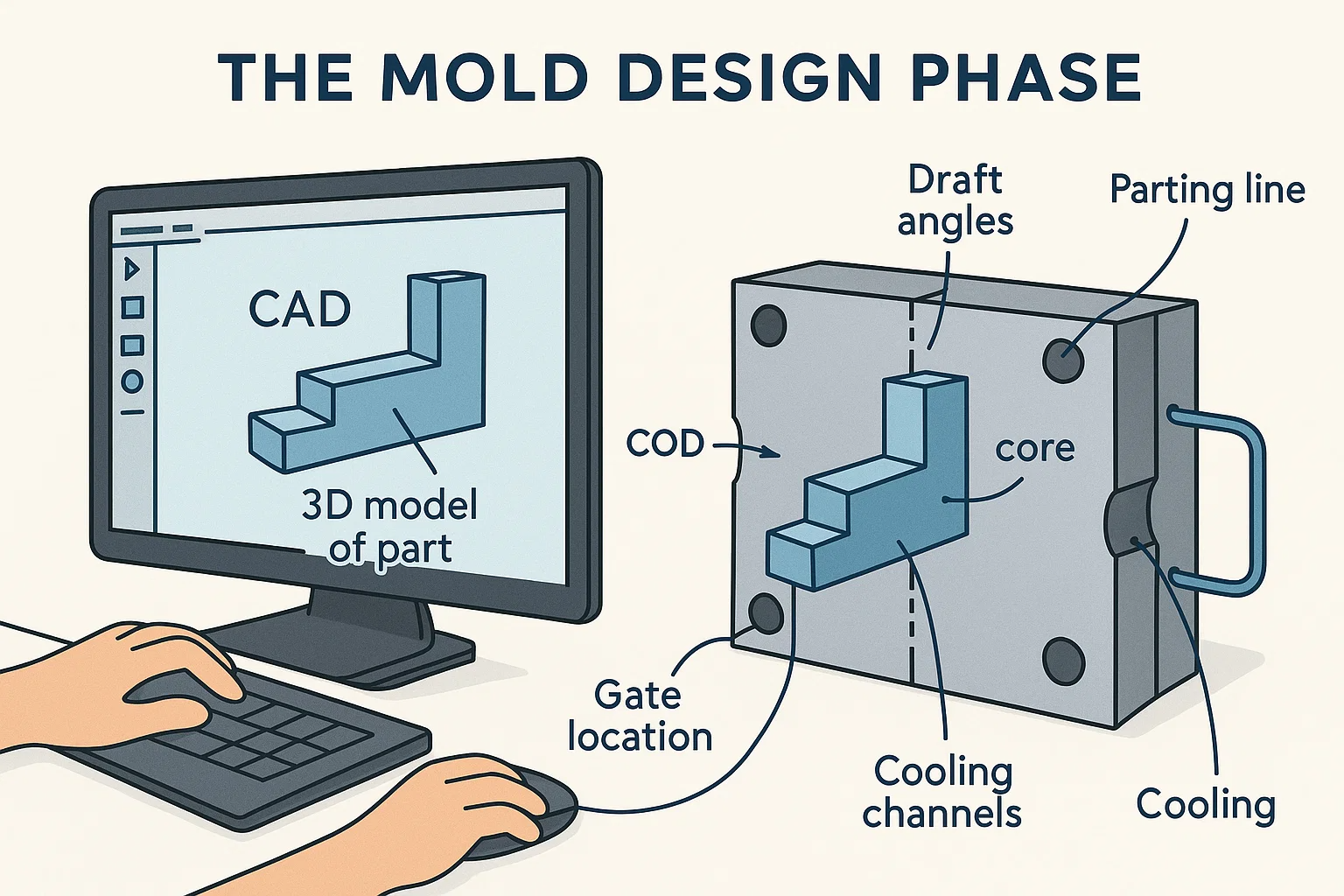 ด้วยความเข้าใจที่ชัดเจนว่าการฉีดขึ้นรูปเปลี่ยนพลาสติกดิบเป็นชิ้นส่วนที่เสร็จแล้วตอนนี้เราสามารถชื่นชมความสำคัญยิ่งของ ขั้นตอนการออกแบบแม่พิมพ์ - นี่คือที่เวทมนตร์เริ่มต้นอย่างแท้จริงเนื่องจากความคิดที่เป็นนามธรรมและภาพร่าง 2D พัฒนาเป็นพิมพ์เขียวดิจิตอลที่แม่นยำซึ่งจะเป็นแนวทางในการสร้างทางกายภาพของแม่พิมพ์ เป็นกระบวนการที่พิถีพิถันซึ่งทุกเส้นโค้งมุมและมิติของชิ้นส่วนพลาสติกสุดท้ายได้รับการพิจารณาอย่างรอบคอบและแปลเป็นเรขาคณิตของแม่พิมพ์