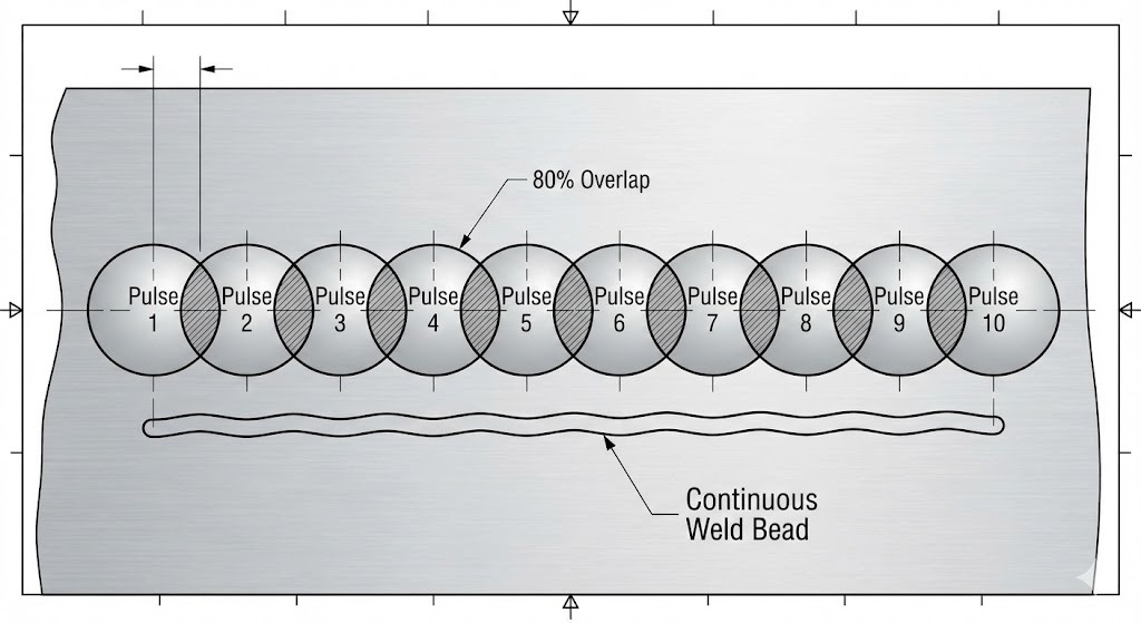 - การเชื่อมต่อเนื่อง/ทับซ้อนกัน: ช่างเทคนิคจะซ้อนทับ "จุด" แต่ละจุดด้วย 70-80% เพื่อสร้างลูกปัดโลหะที่ไร้รอยต่อและแข็งแกร่ง
