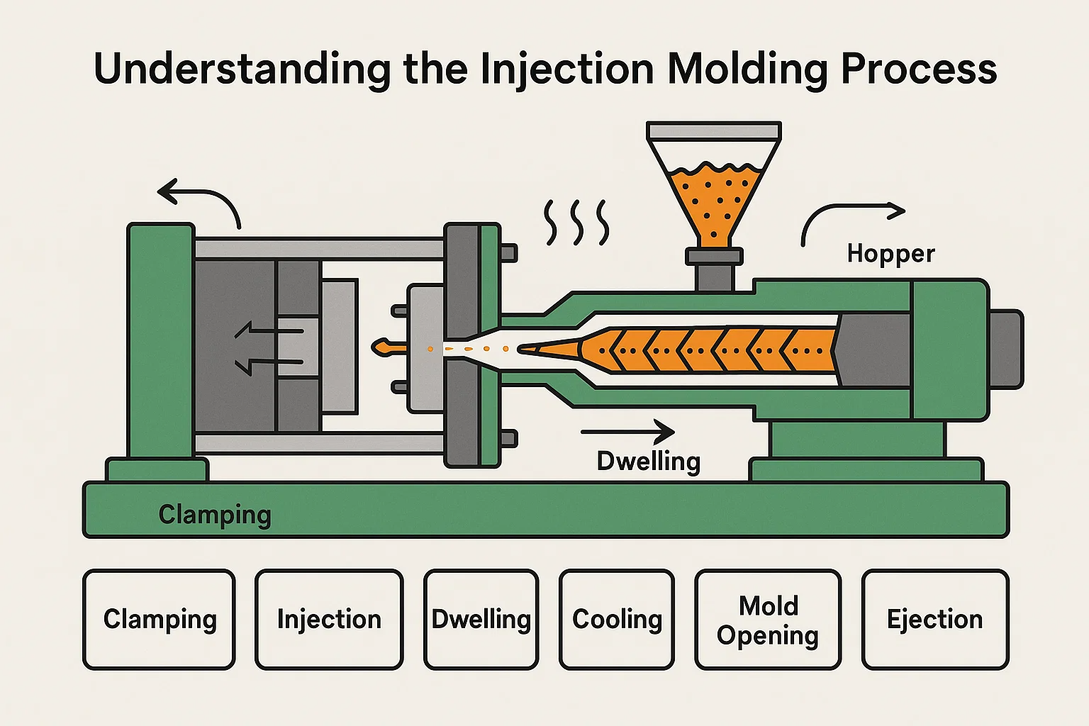 กระบวนการฉีดขึ้นรูปเป็นการดำเนินการวัฏจักรที่ในขณะที่ปรากฏง่ายเกี่ยวข้องกับการควบคุมอุณหภูมิความดันและเวลาที่แม่นยำเพื่อสร้างชิ้นส่วนที่สอดคล้องกัน นี่คือขั้นตอนพื้นฐาน: